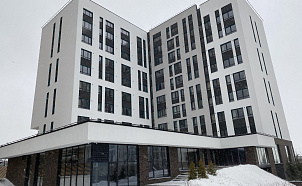 На кровле выполнен логотип из полимерной мембраны красного и белого цвета.